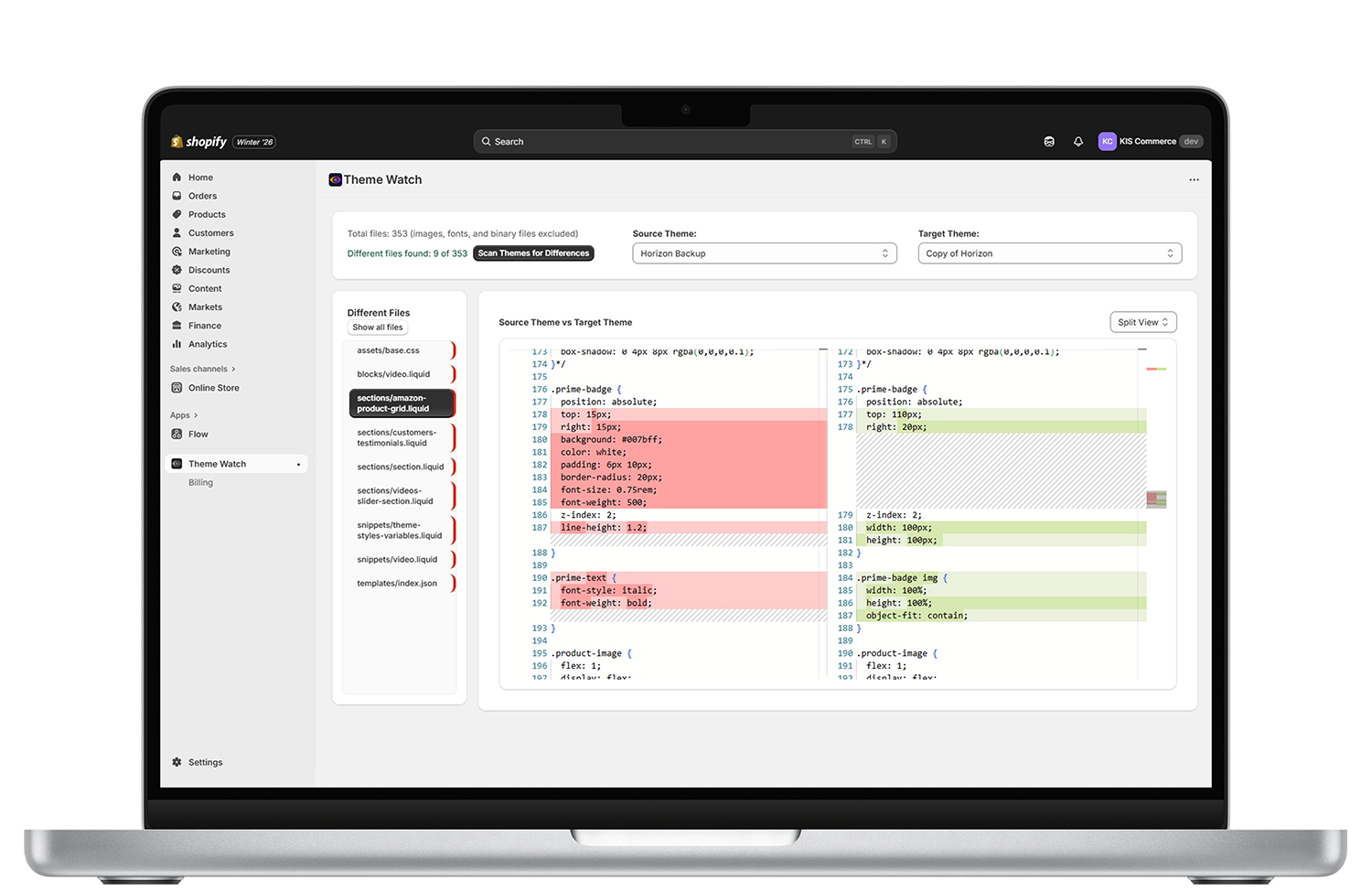 Stop wondering "what changed?" or "will this break my store?" Compare themes in seconds and know exactly what's different before you publish any updates.